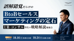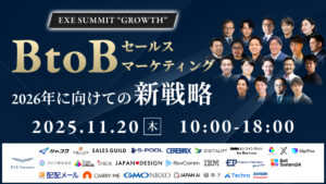 【終了】EXE SUMMIT2025 セールス/マーケティング × 経営戦略 固定観念を壊し、次の成長戦略へ。 2025.9.28 BtoBマーケティング終了 イベントページはこちら https://exe-partnerz.com/20250709_conference 日時:2025年7月9日(水) 10:00 – 17:30 場所:オンライン開催 参加費:無料 主催:株式会社EXE Partnerz